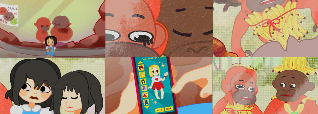 On an afternoon in a zoo, a couple of orangutan lives. One day, a little game stopped by their window to play a game on her phone, and the orangutans were enchanted by what they saw. They decided they could play it in real life, turning the zoo into a fashion show.Roles